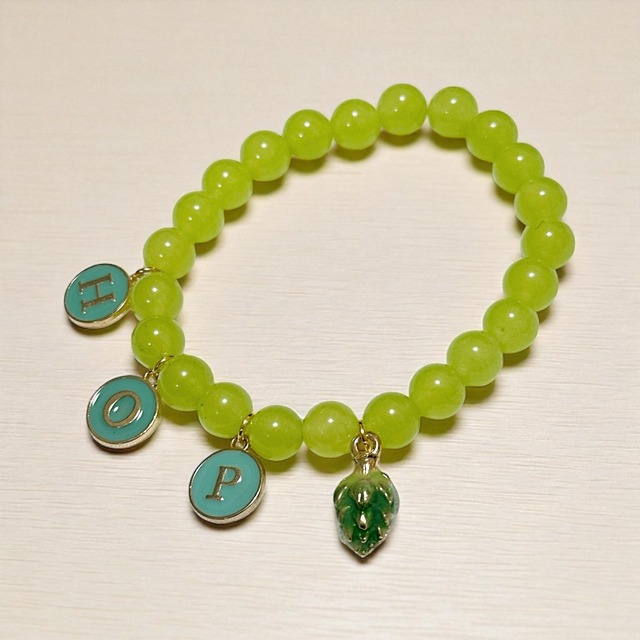 アルファベットHOPストーンブレスレット グリーングラデーション 濃淡さまざまなグリーンストーンのブレスレットに、「HOP」のアルファベットチャームと3Dホップのチャームが付いています。 ブレスレットは伸縮性があり、装着も簡単! ホップ畑をイメージした色合いのブレスレットです。 ※ストーンは色・大きさ・形・模様に若干の違いがあります。クラック(ひび)、内包物等は自然由来のものです 【サイズ】アルファベット:1.2cm 3Dホップ:0.9cm×1.8cm ブレスレット:19cm 【素材】アルファベット:エナメル、合金 3Dホップ:合金 ブレスレット:人工石 ★ギフトラッピングはこちら★※発送方法は宅配便になります https://wewearbeer.theshop.jp/items/81507935