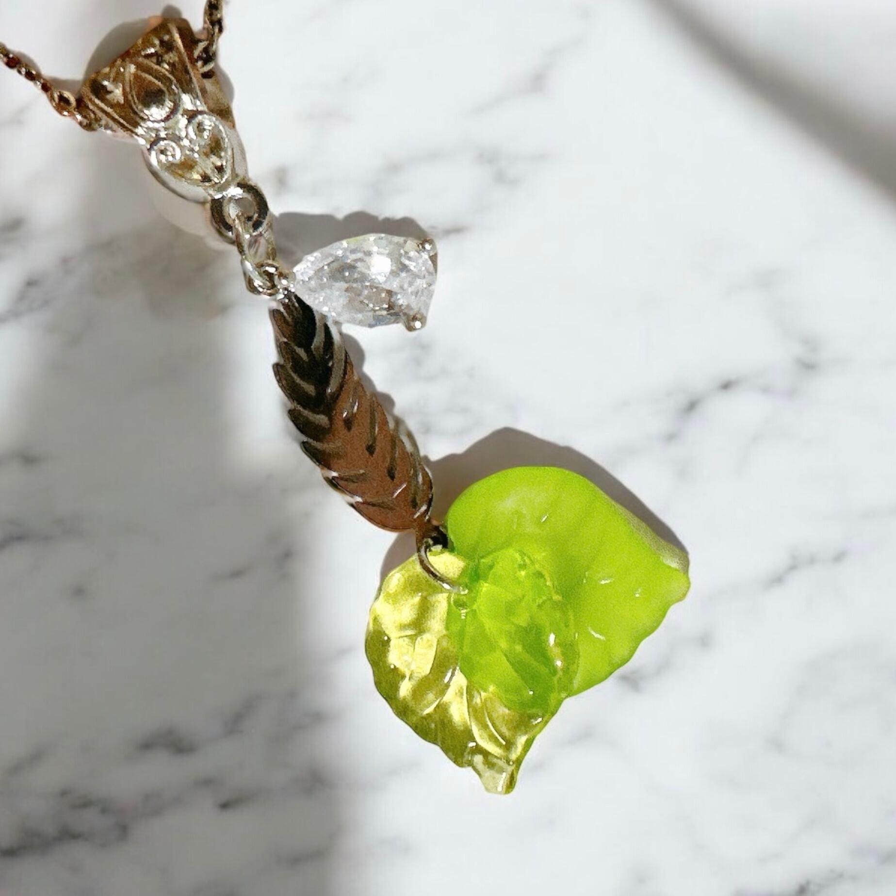 雫の形のストーンはガラスのカットが綺麗で、光に当たると華やかに輝きます。