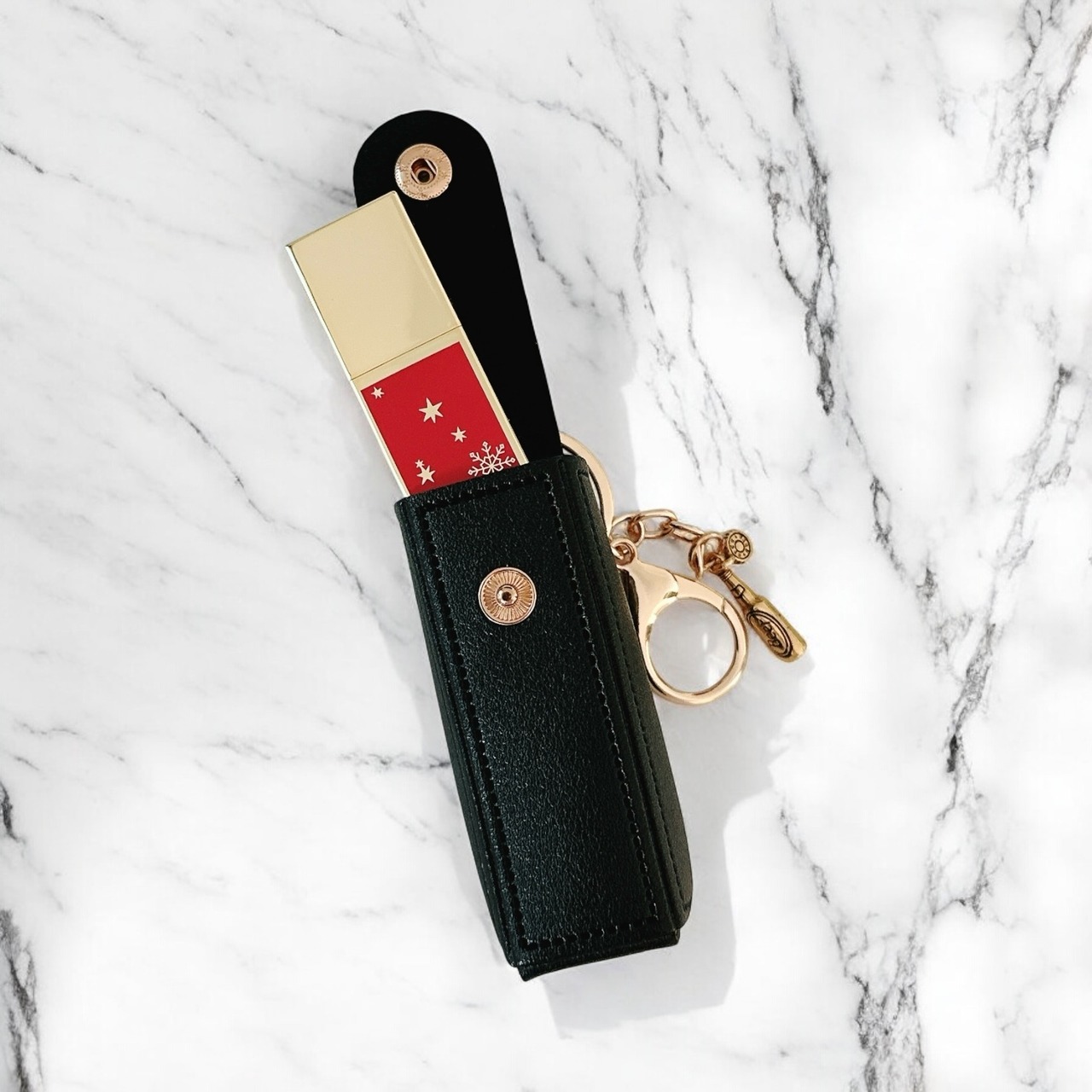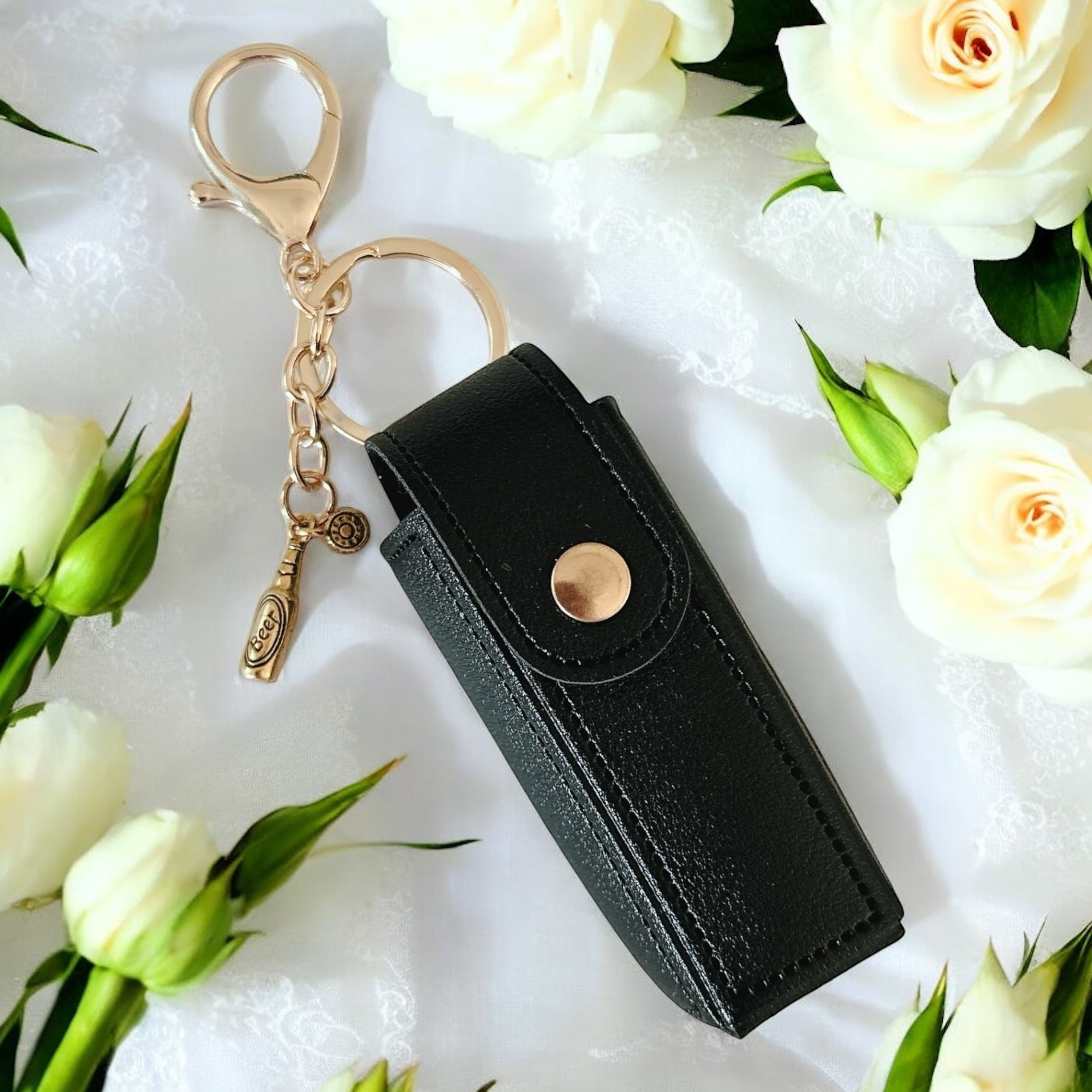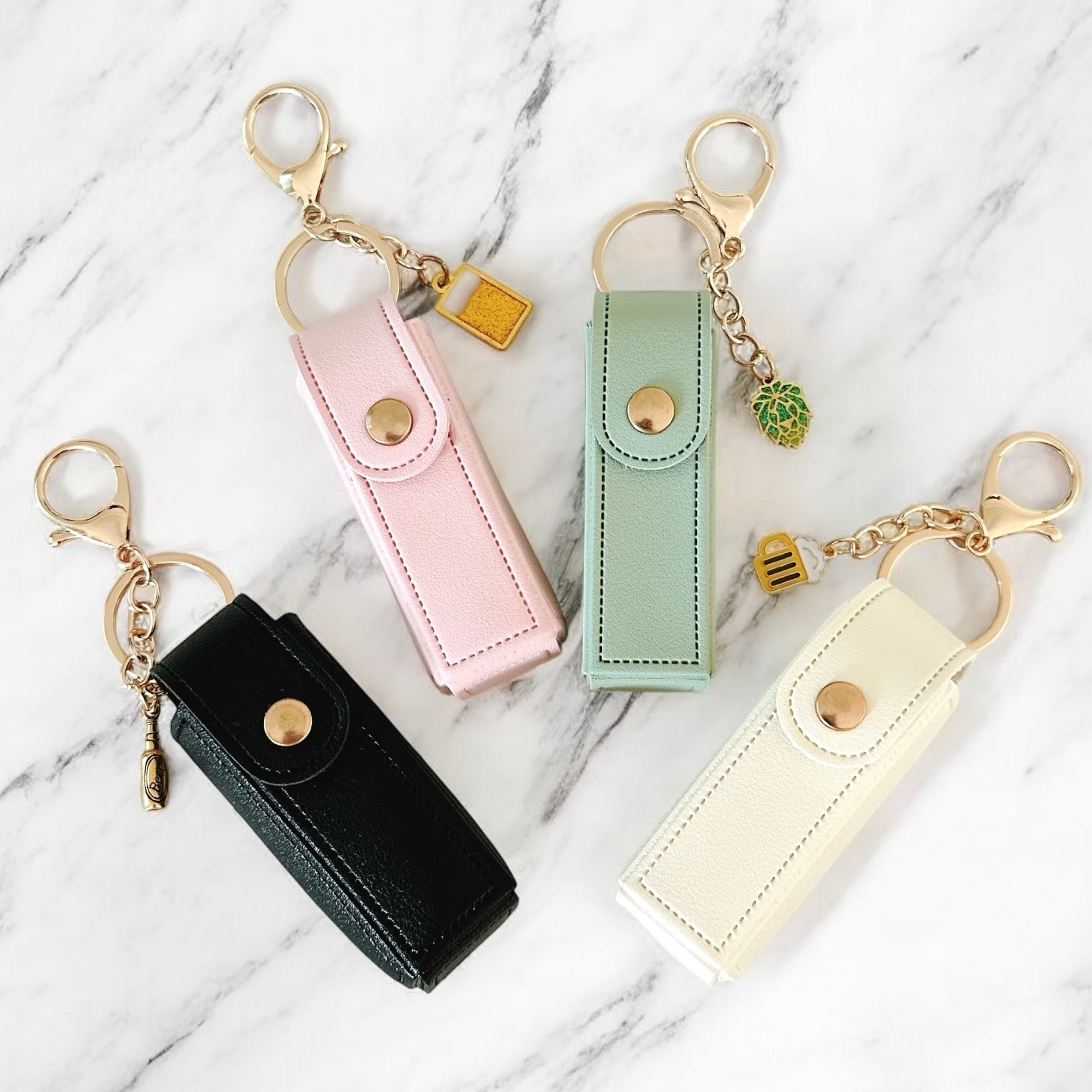 ゴールドの瓶ビールチャームが付いたリップケースです。