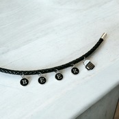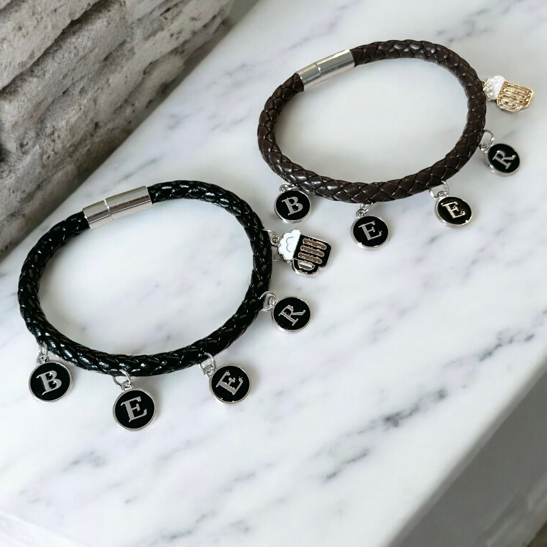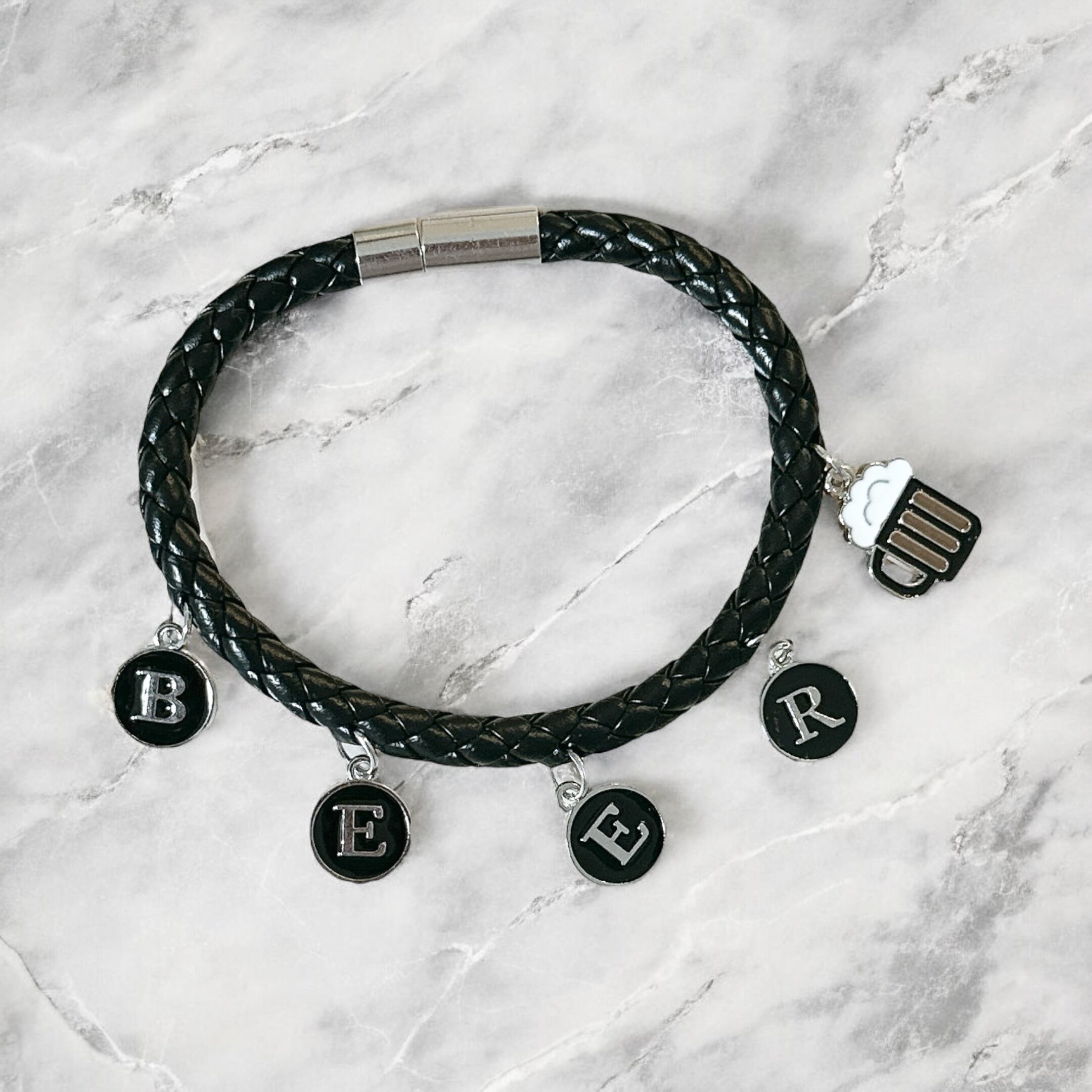 編み込みのレザーブレスレットに、アルファベットの「BEER」とColorful beersブラックのチャームがついています。