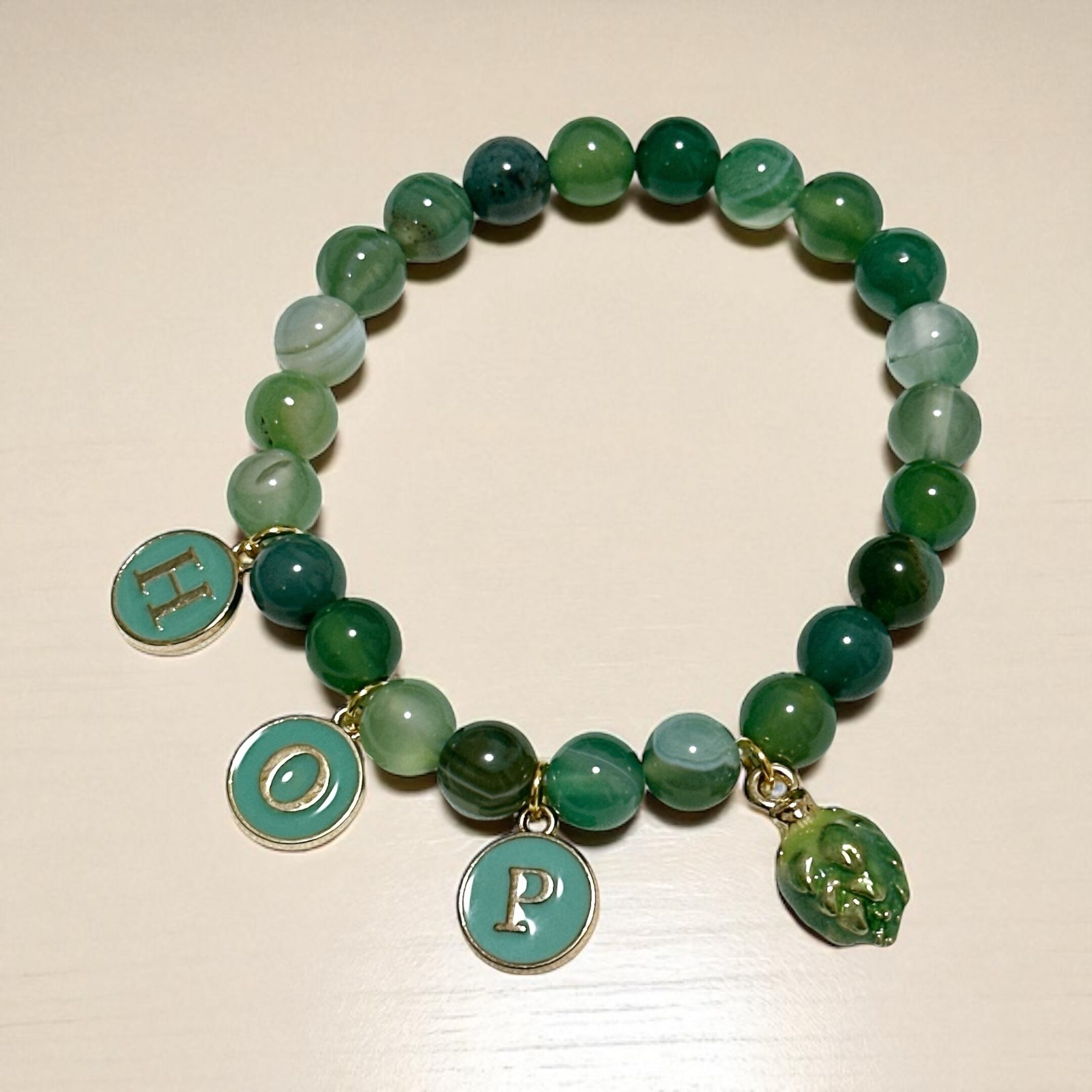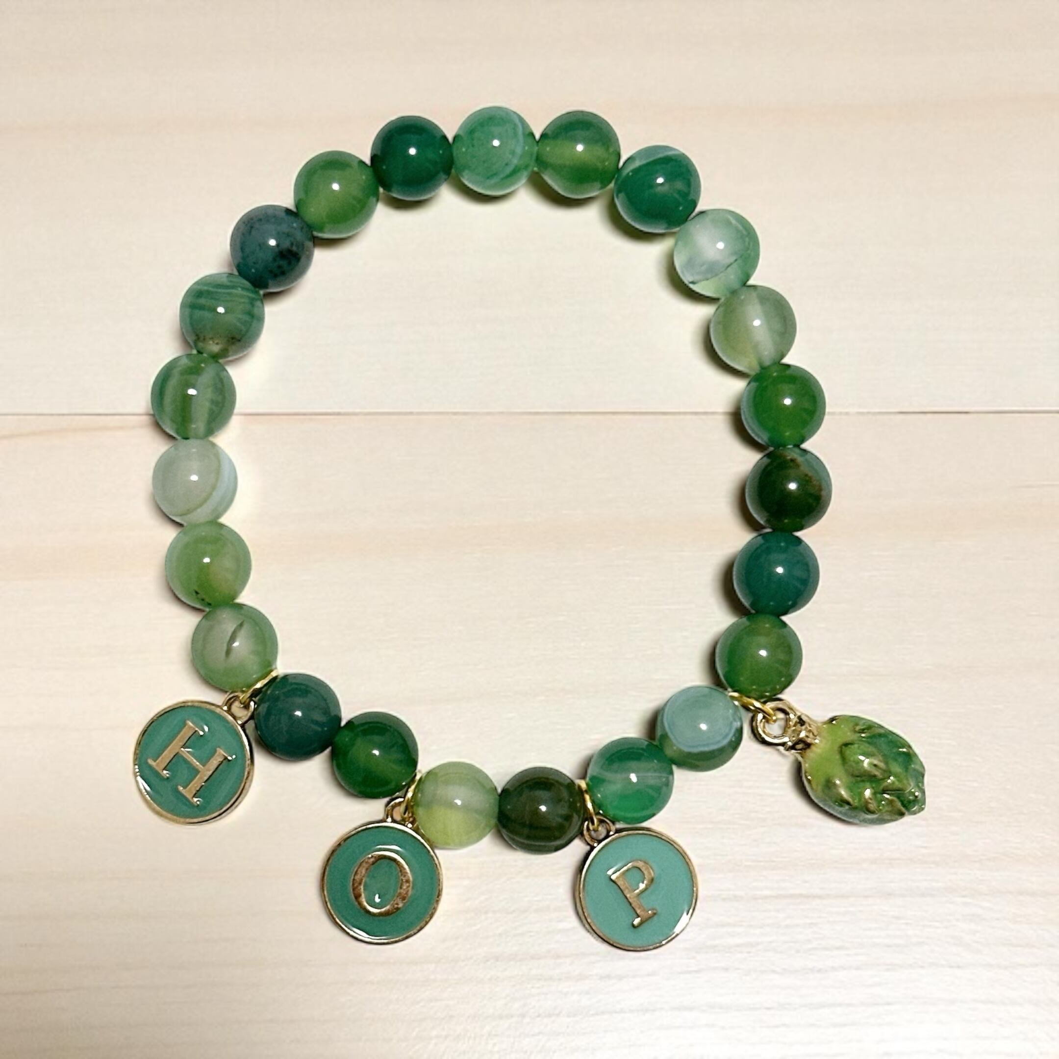 濃淡さまざまなグリーンストーンのブレスレットに、「HOP」のアルファベットチャームと3Dホップのチャームが付いています。
