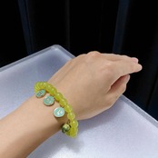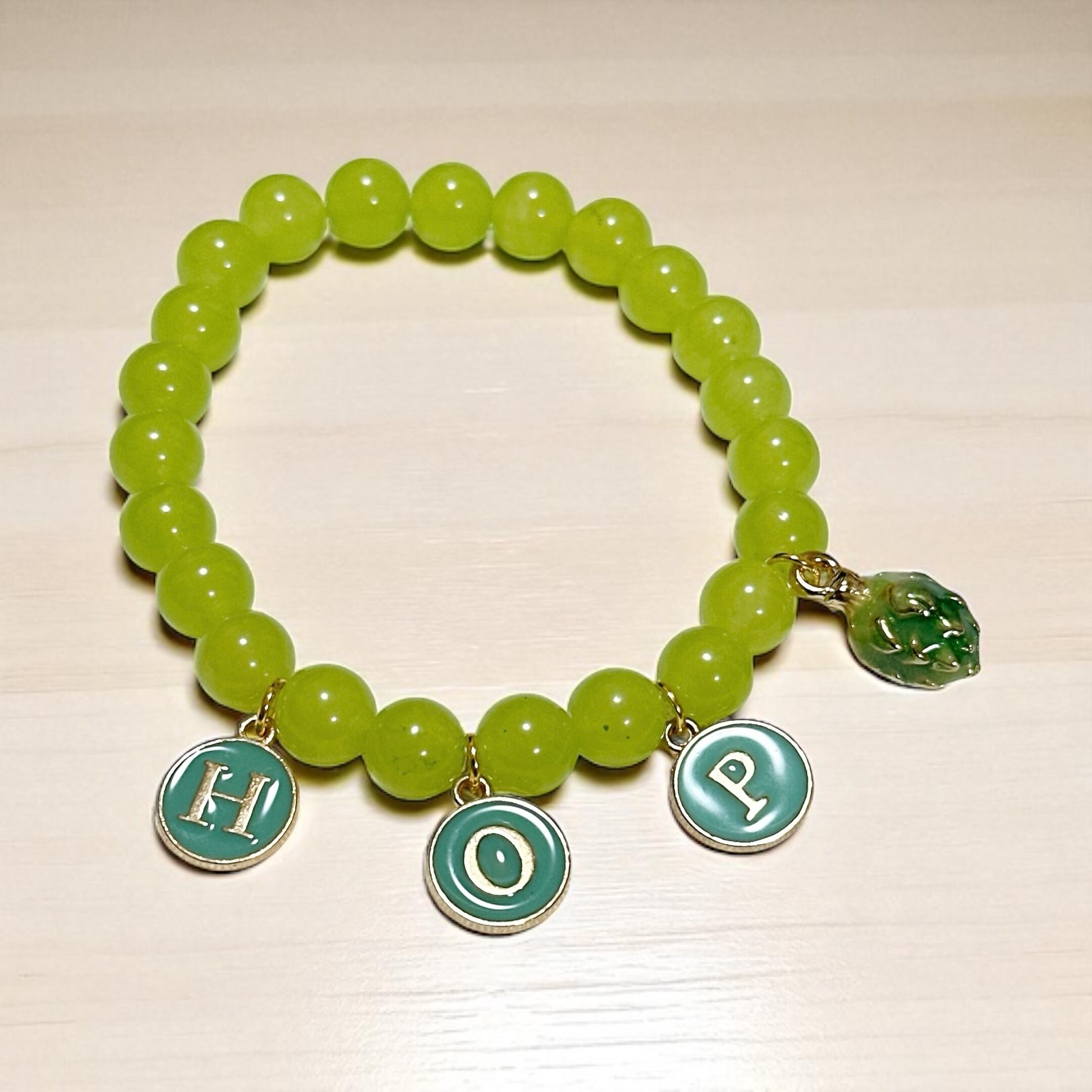 透明感のあるライトグリーンのストーンブレスレットに、「HOP」のアルファベットチャームと3Dホップのチャームが付いています。