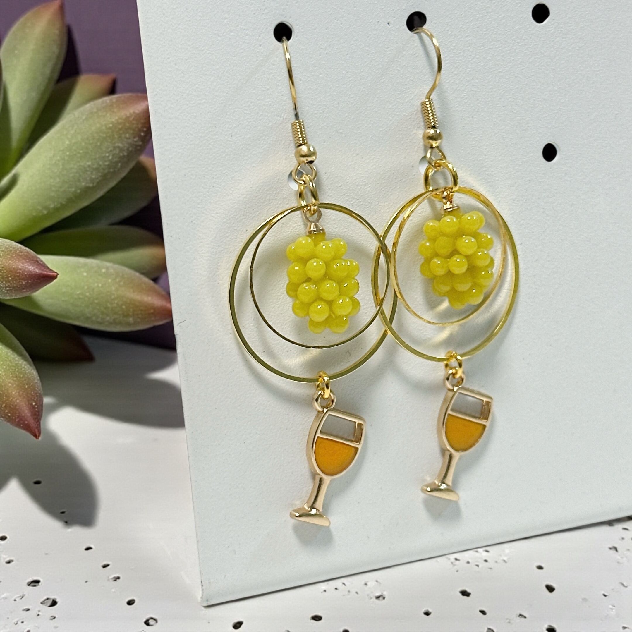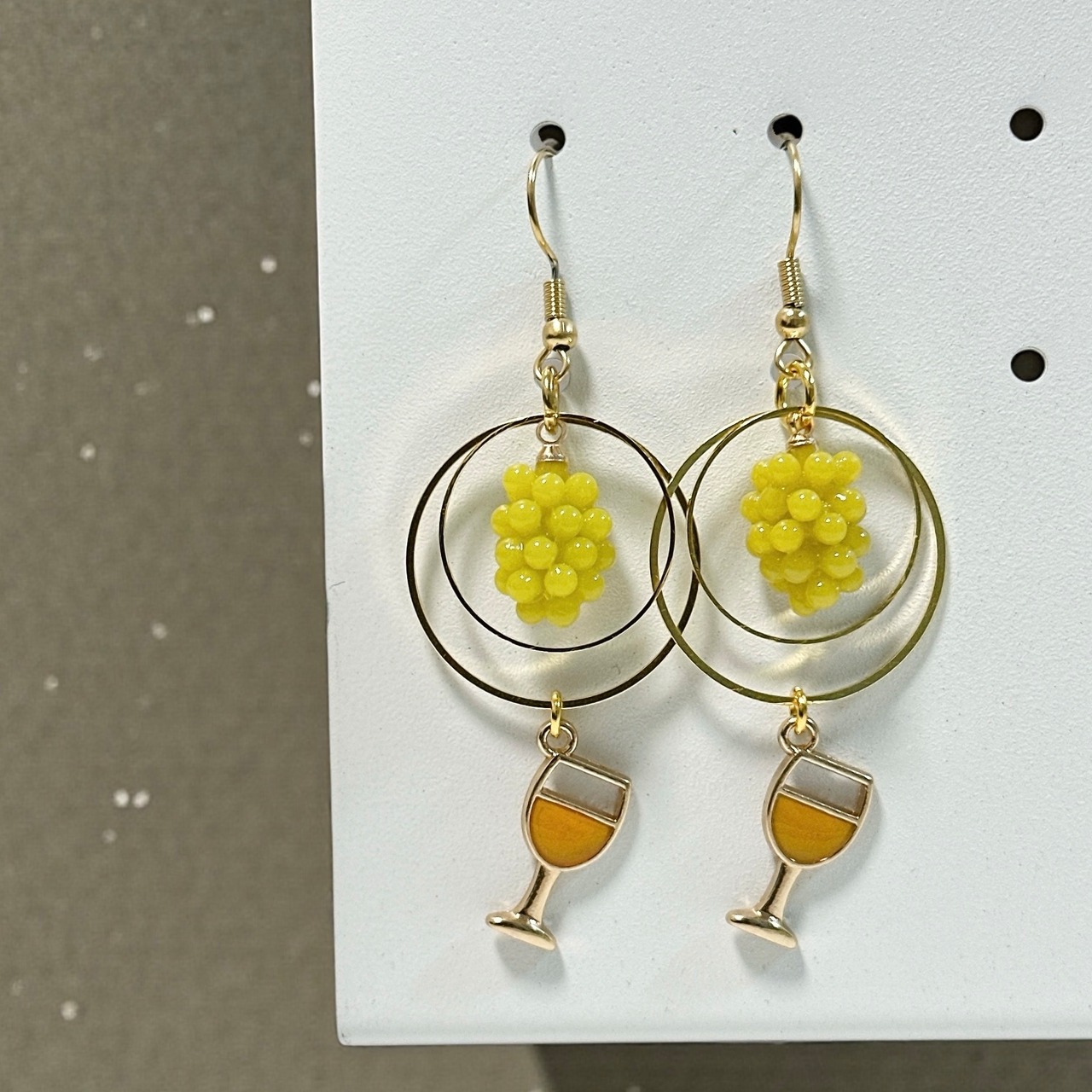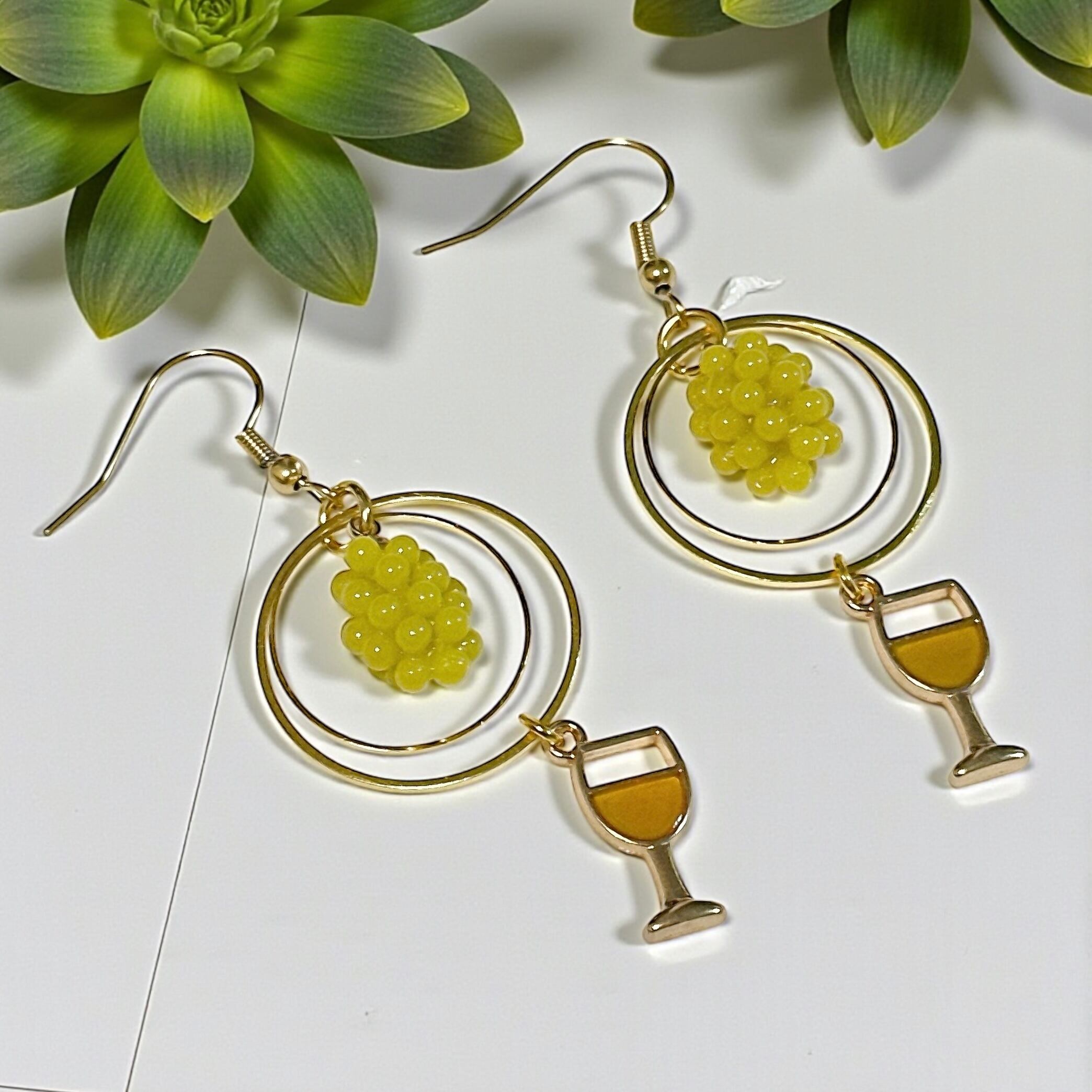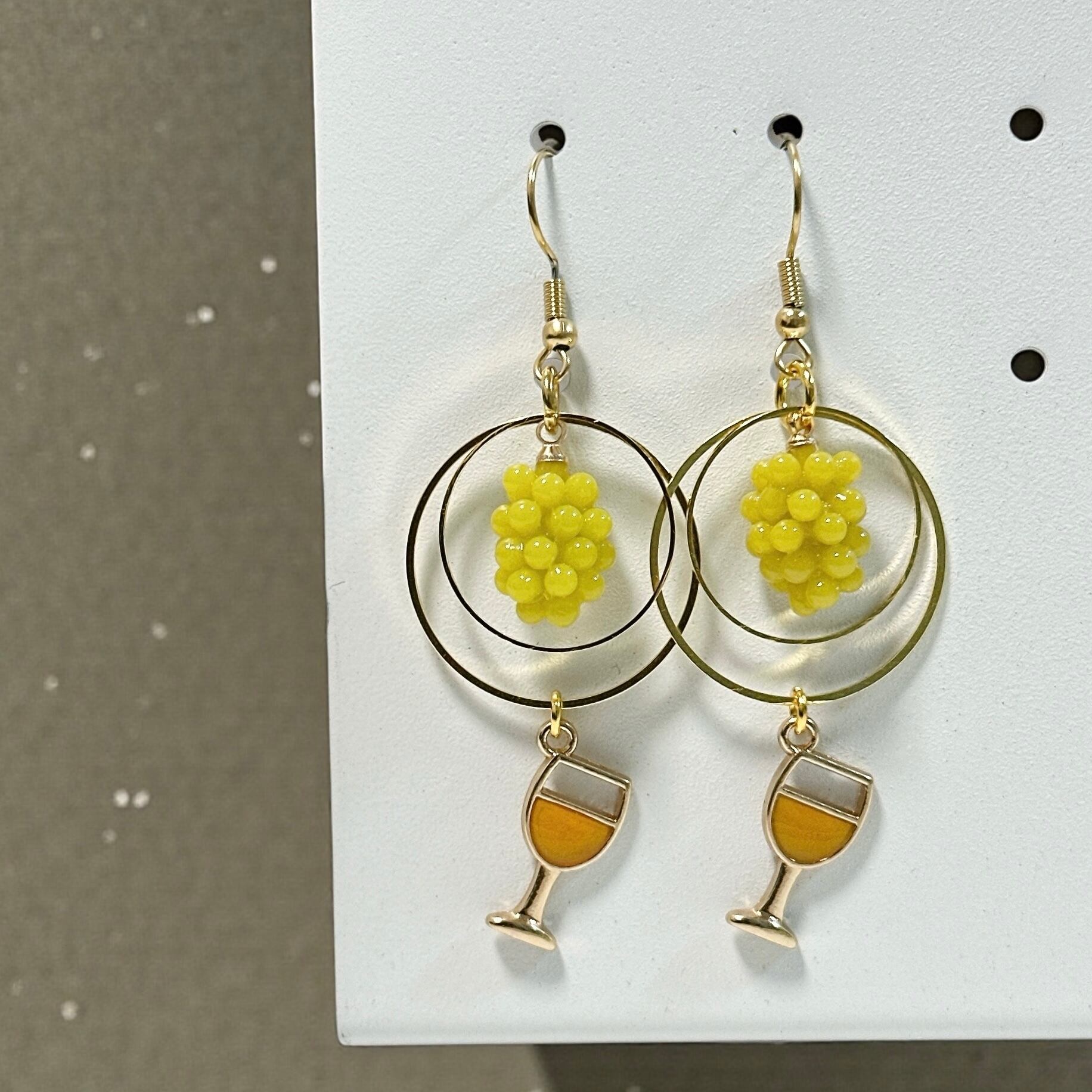 オレンジワインチャームと立体的な白ぶどうのチャームがついたピアスです。