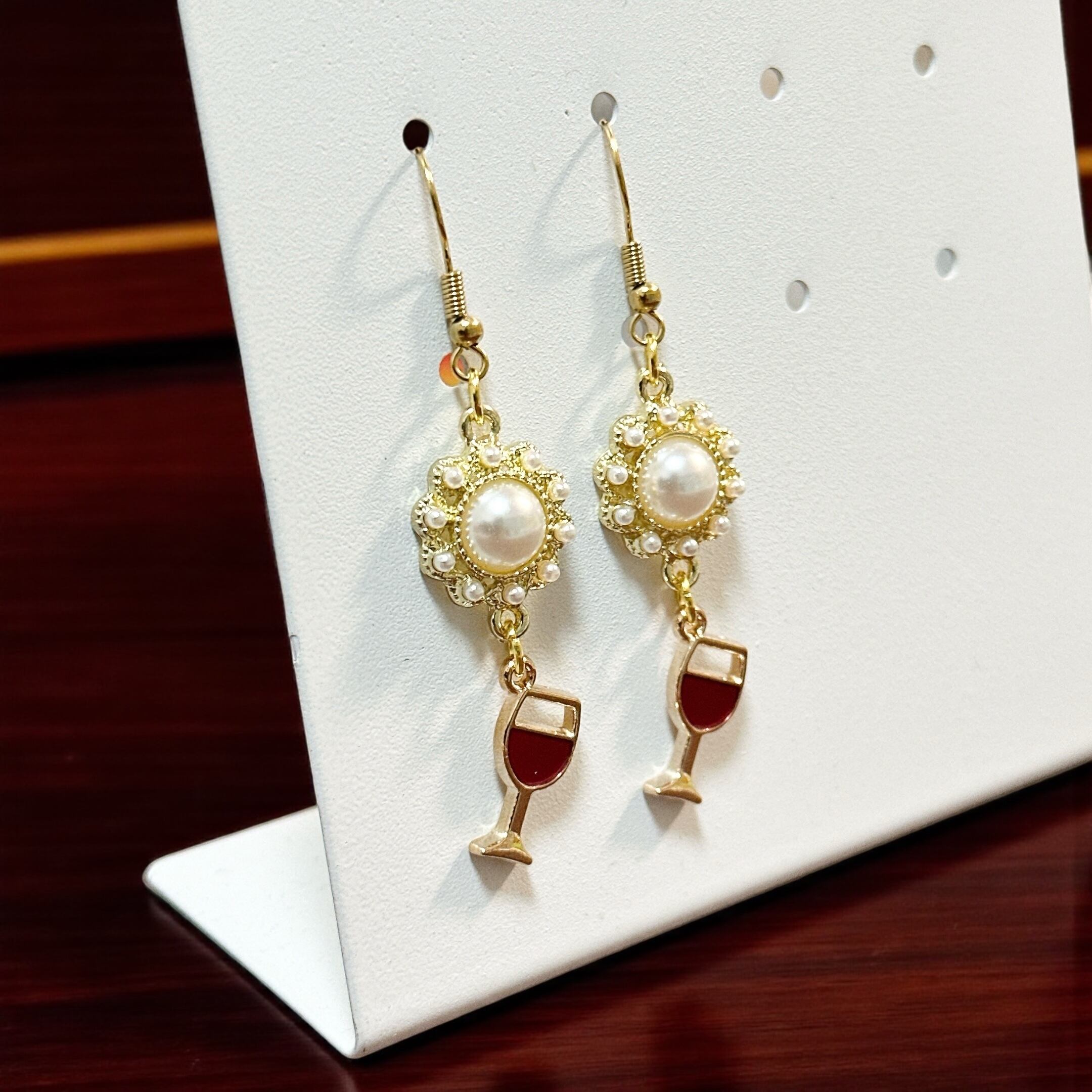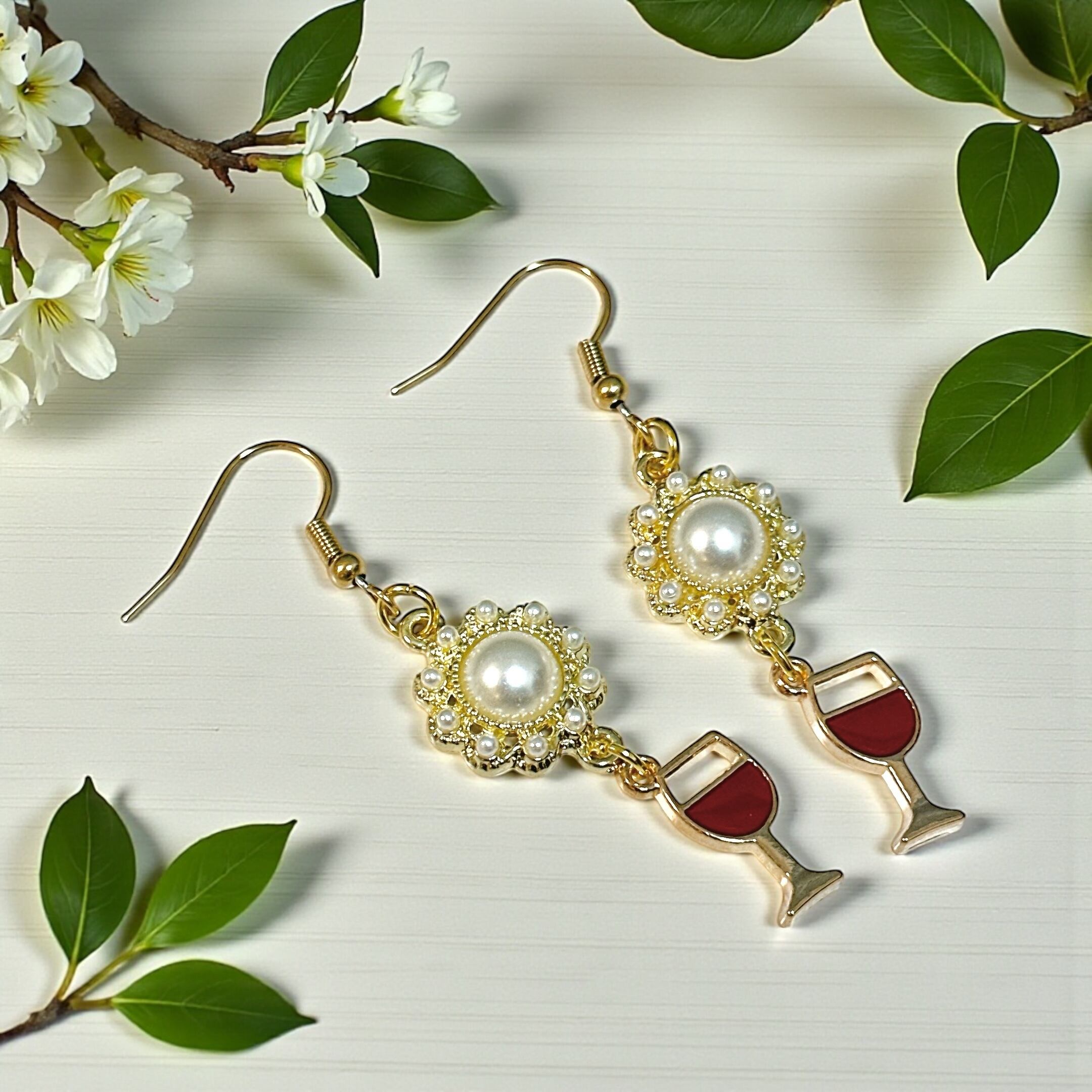 赤ワインチャームとパールのチャームがついたピアスです。