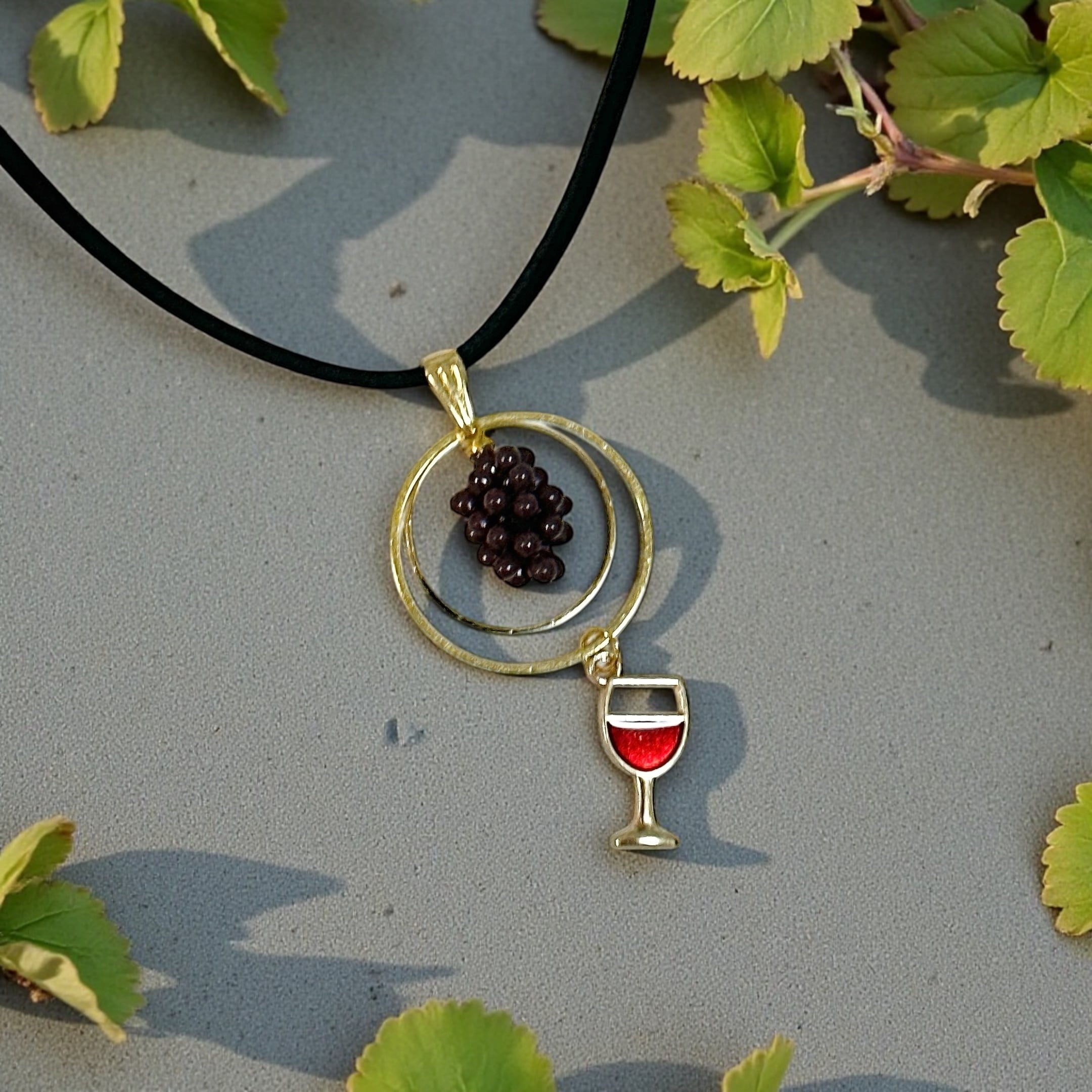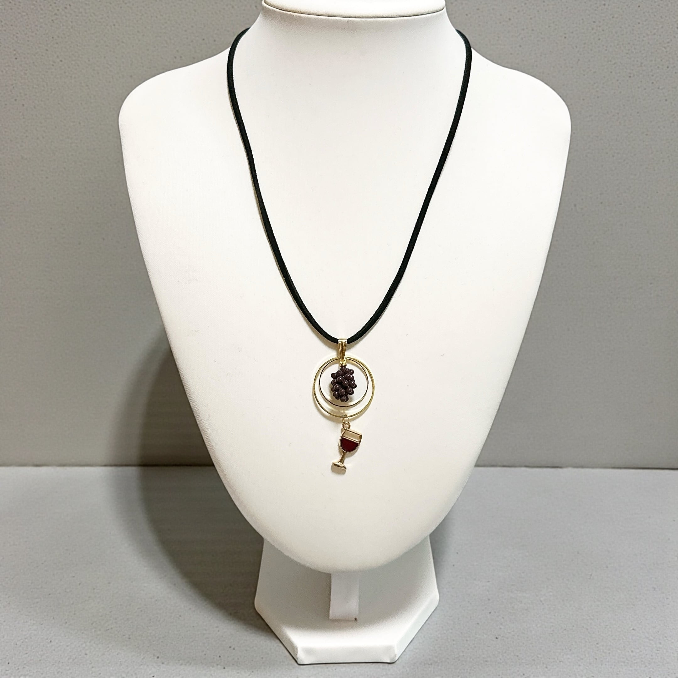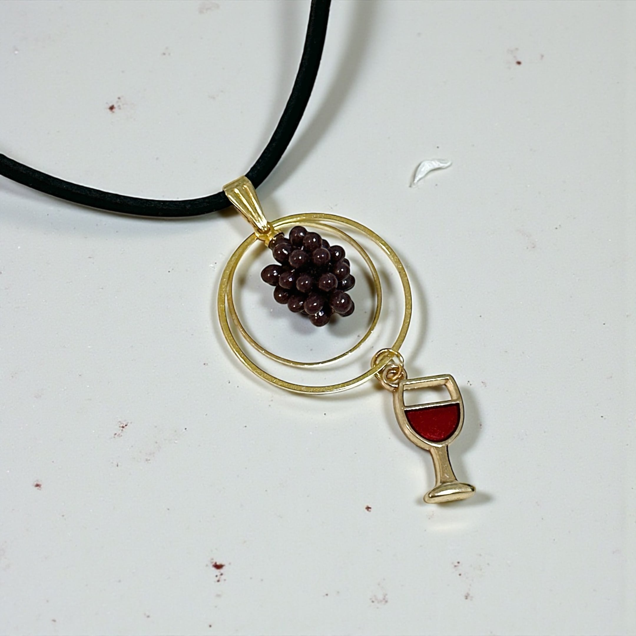 赤ワインのチャームと立体的なぶどうのチャームがついたネックレスです。