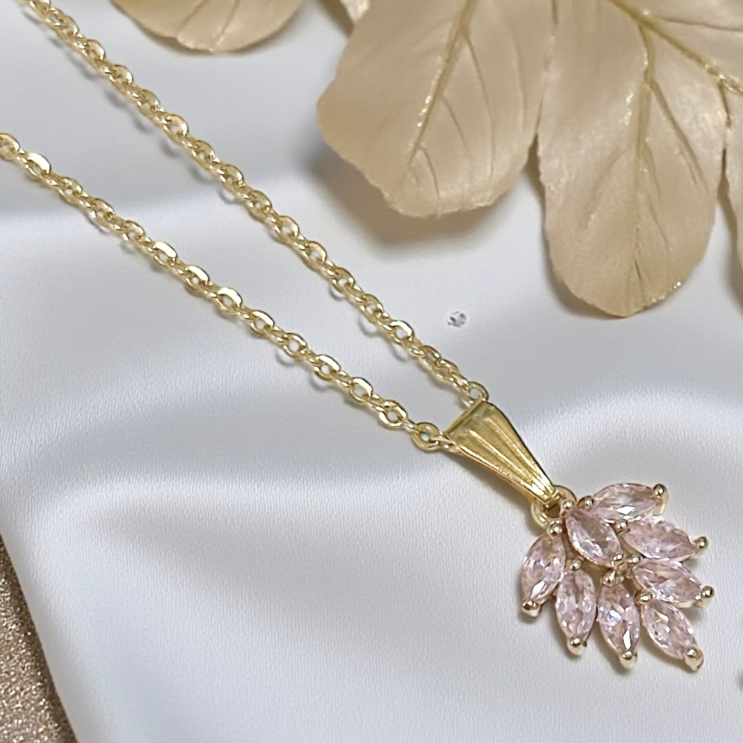ネックレスのトップは小さめながら、ストーンのカットが繊細で、光に当たると強い輝きを放ちます。