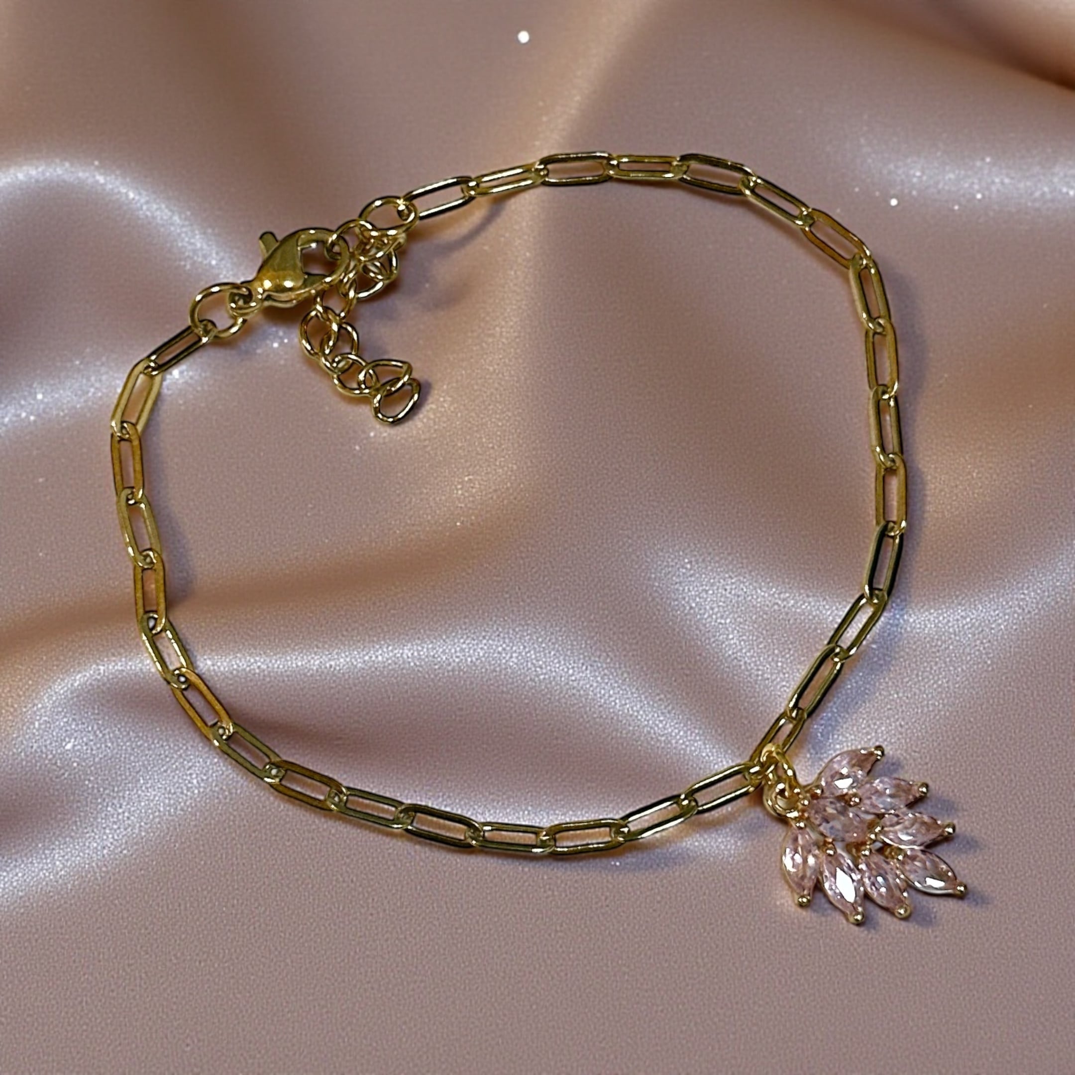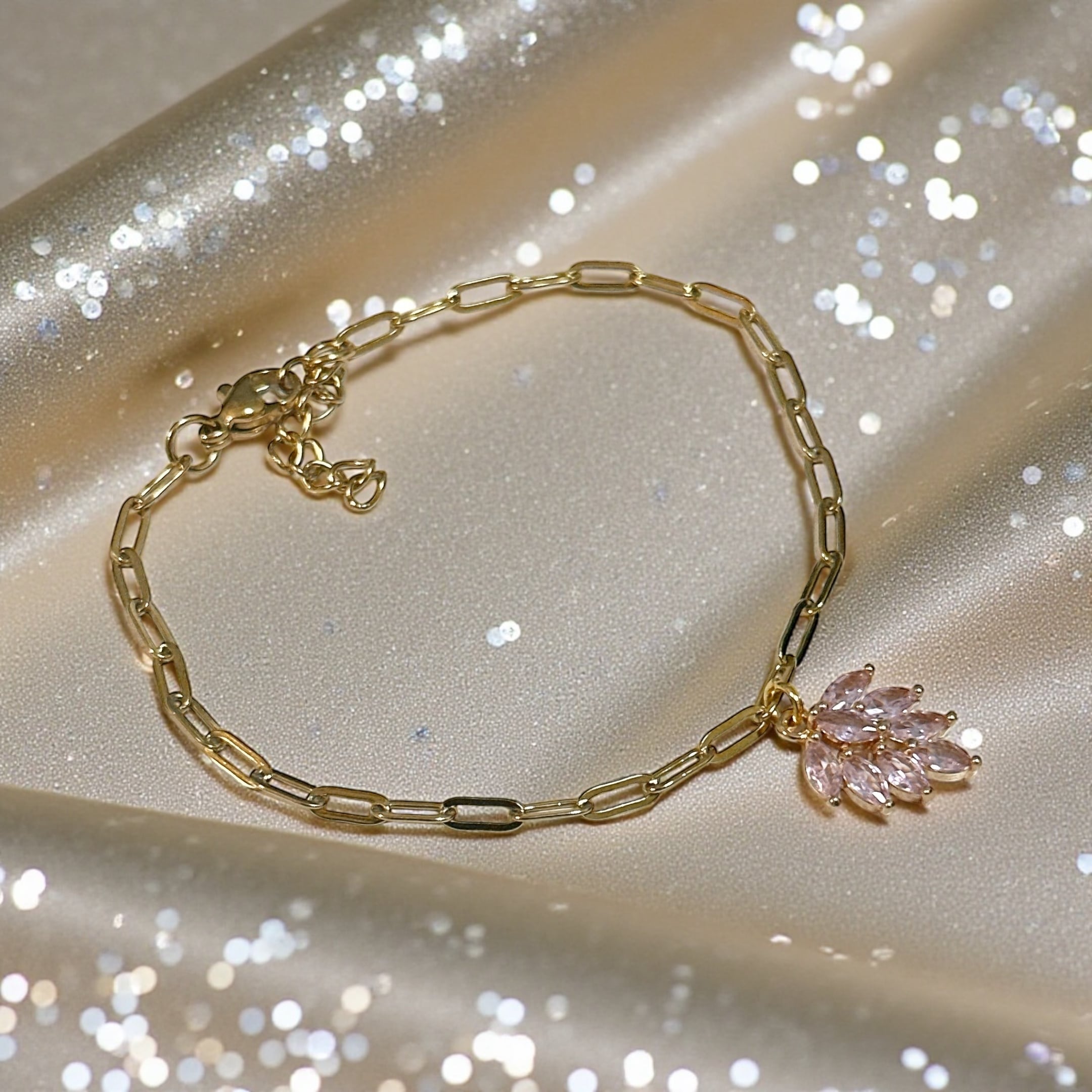 ブレスレットは細めのチェーンで、パーティードレスなどの華やかな服装にも合わせやすく、ラグジュアリーな空間にも馴染みます。