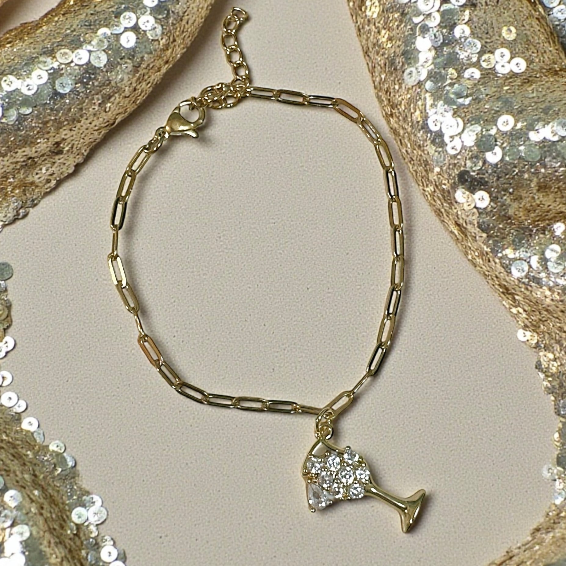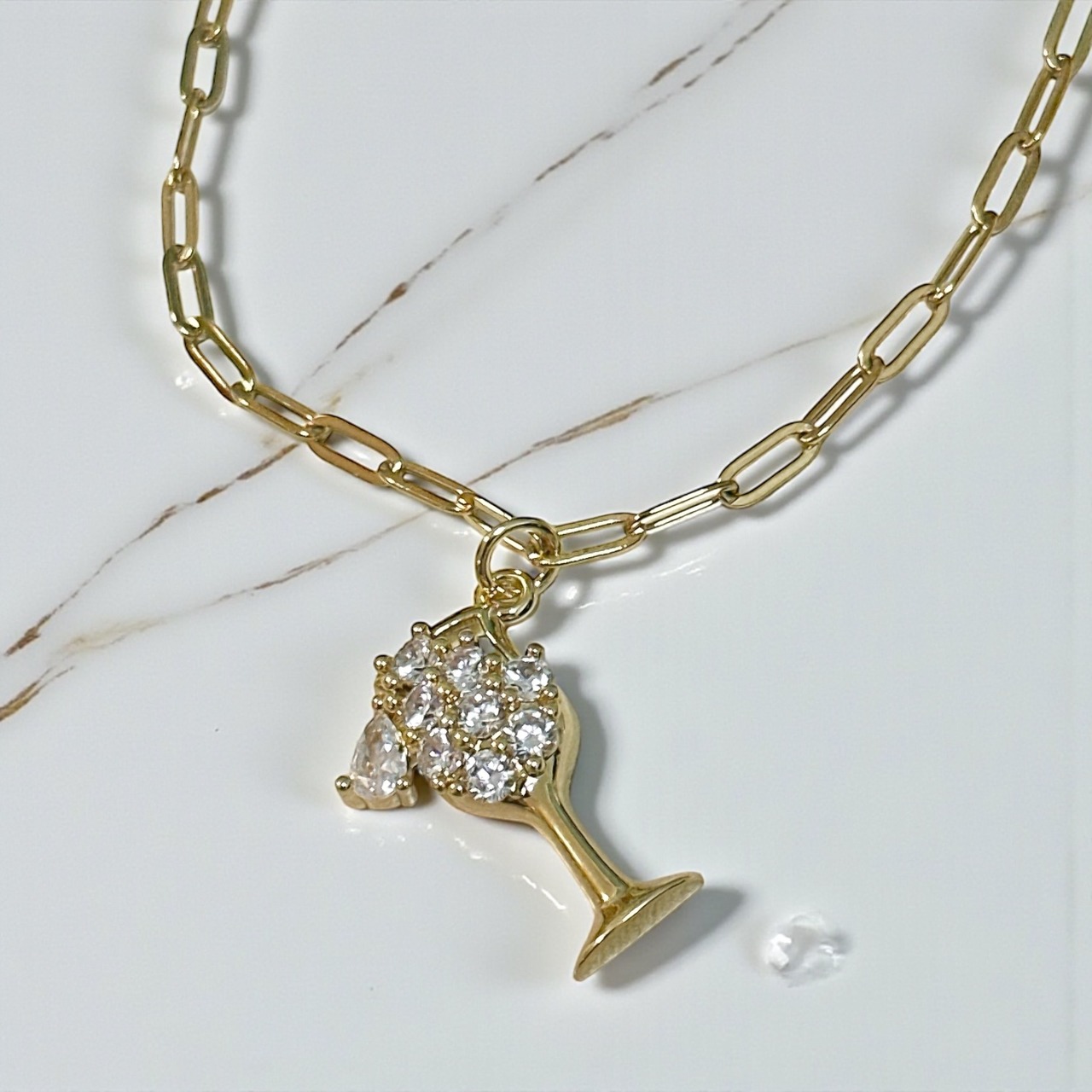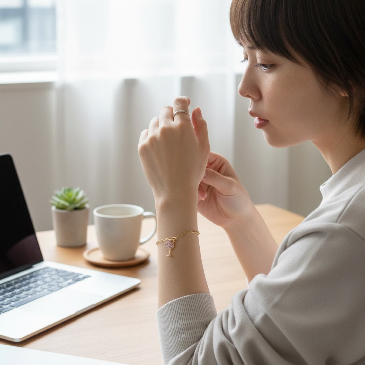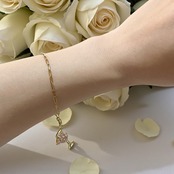 ブレスレットは細めのチェーンで、パーティードレスなどの華やかな服装にも合わせやすく、ラグジュアリーな空間にも馴染みます。