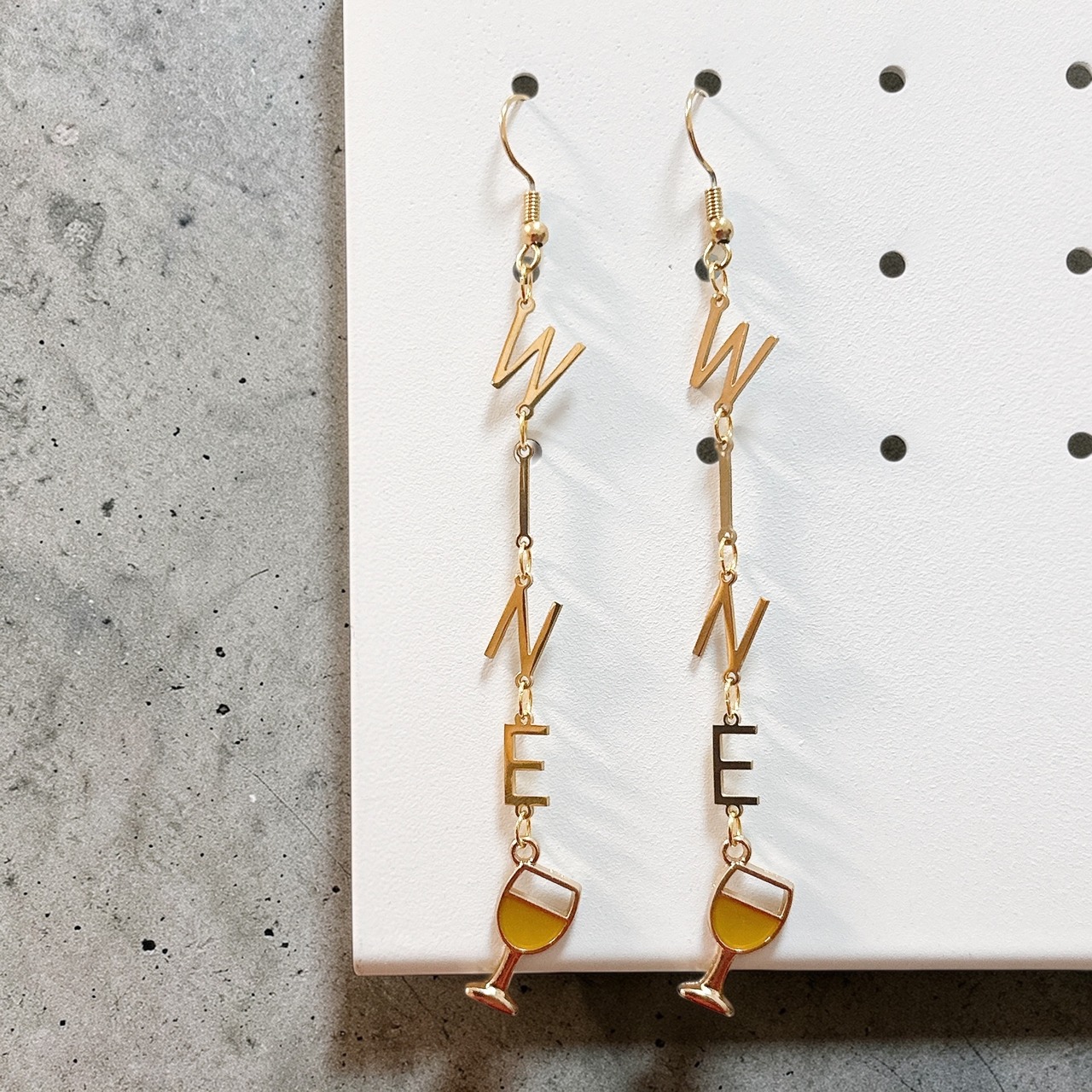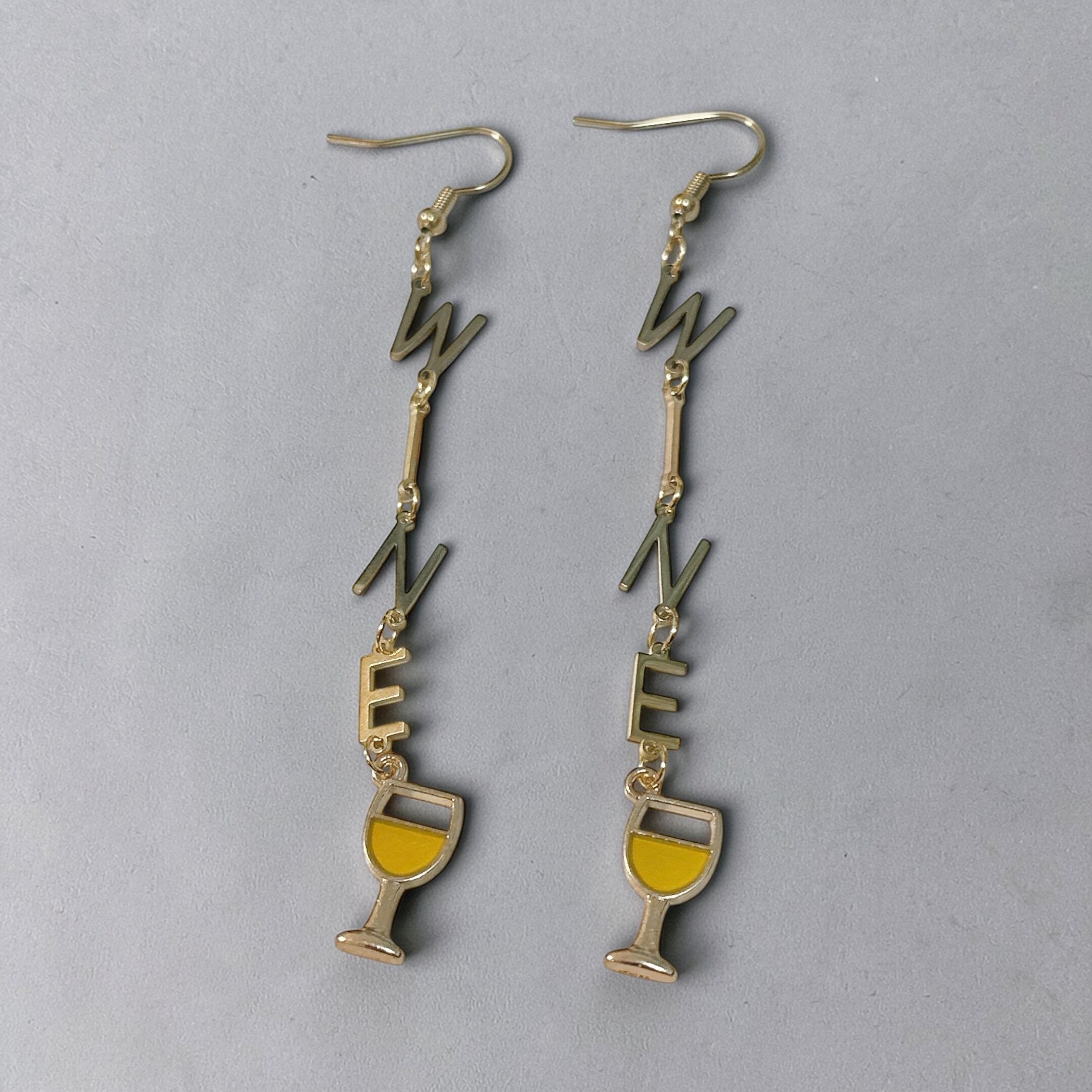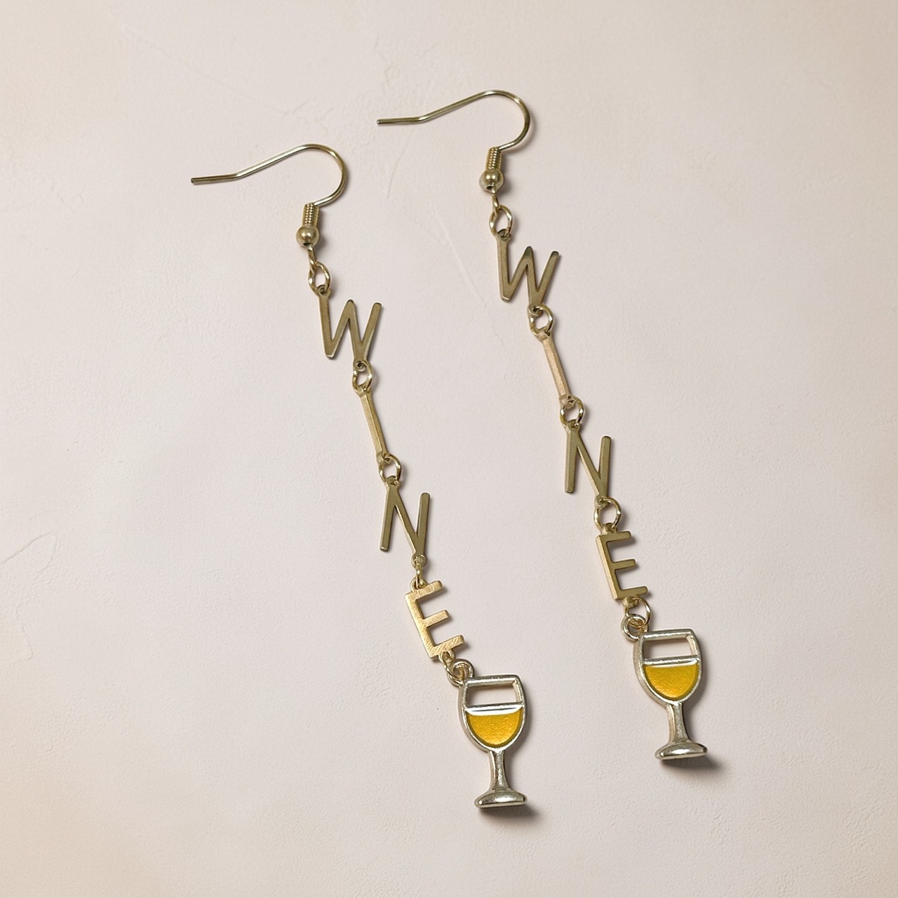 ゴールドの「WINE」のアルファベットチャームが縦に連なり、白ワインのチャームがついています。