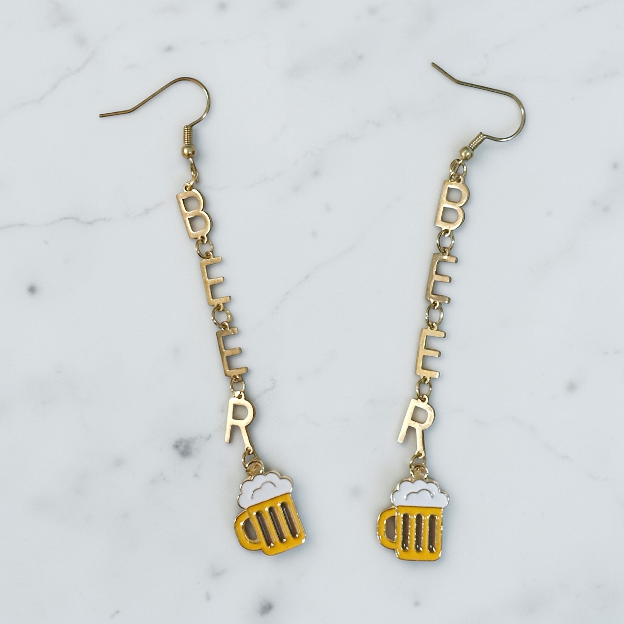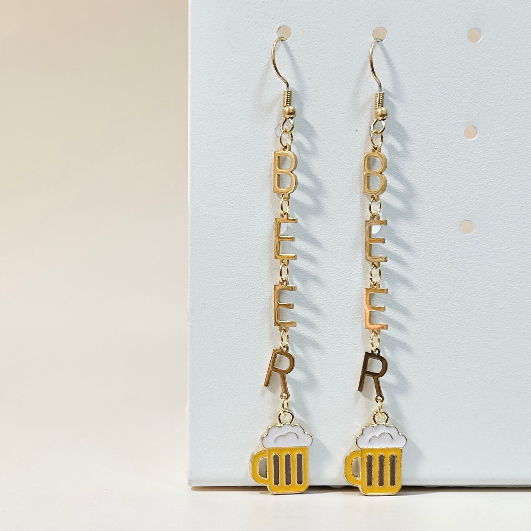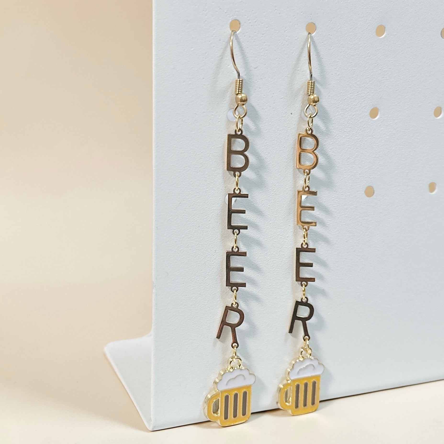 シンプルな「BEER」のアルファベットチャームが縦に連なったピアスです。
