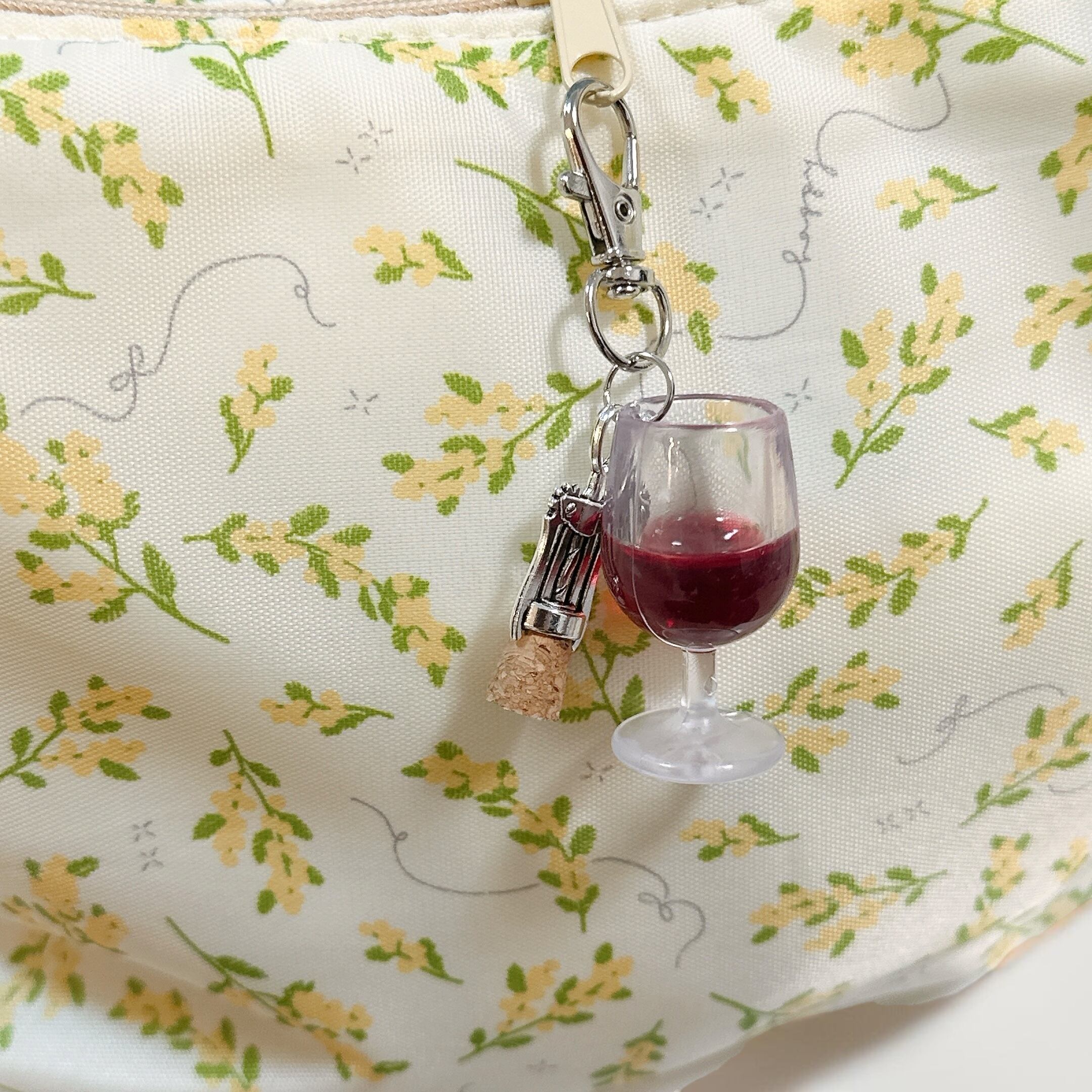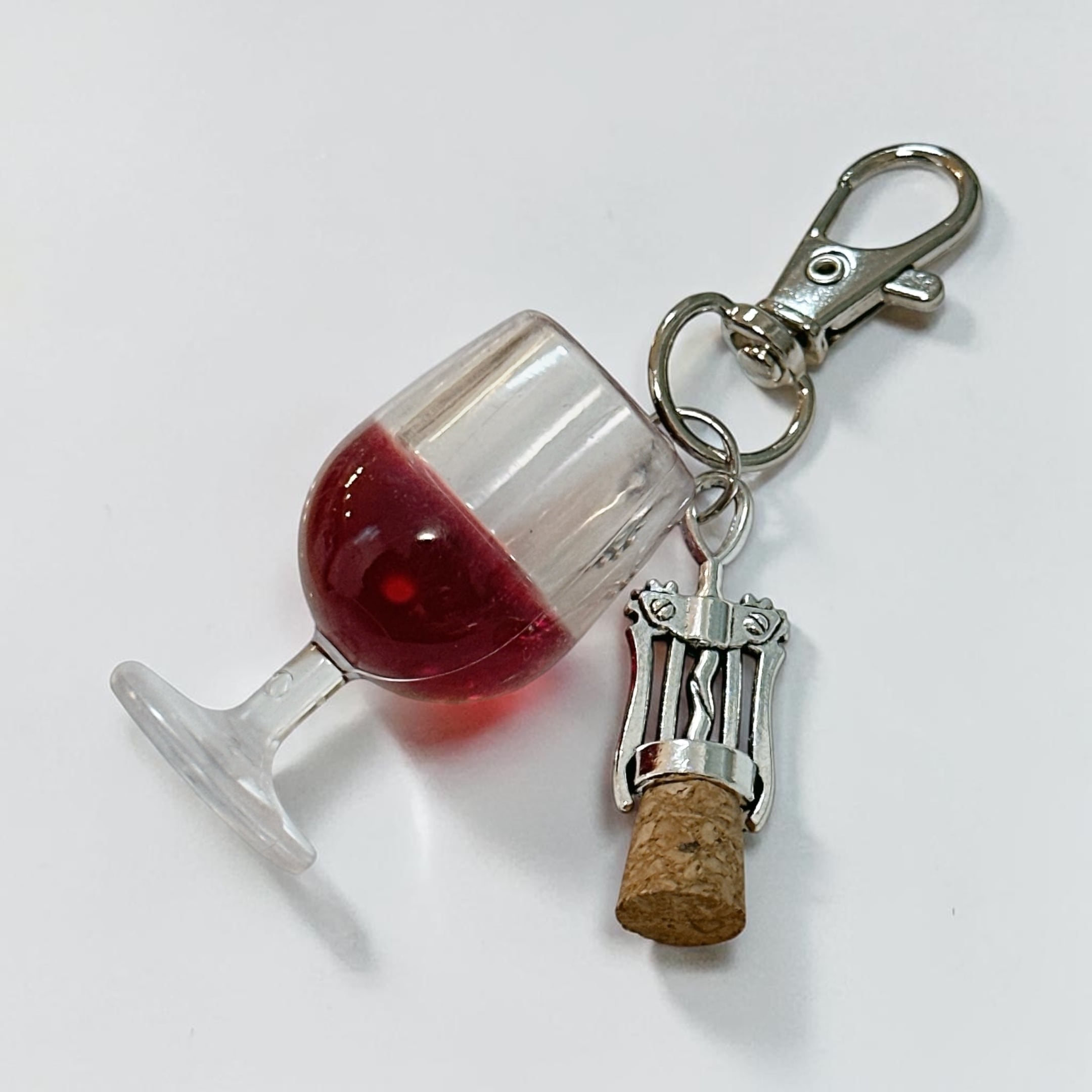 赤ワインとワインオープナーのチャームがついたキーホルダーです。