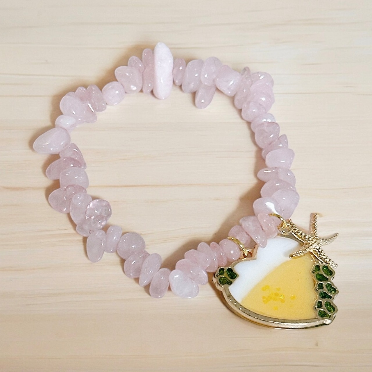 可愛らしいピンク色の天然石ブレスレットに、LOVE HOPとヒトデのチャームをつけています。